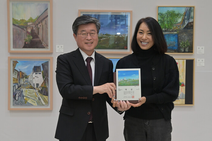 | ▲ 김길성 구청장과 대상을 수상한 박혜영 작가가 기념촬영을 하고 있다.(사진=중구청 제공) |