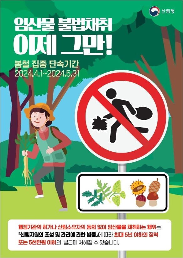 이번 집중단속 대상은 산림 소유자의 동의 없는 두릅, 취나물, 음나무, 고사리 등 임산물 불법 채취를 비롯해 임산물 채취를 위한 수목 훼손 행위, 산림내 취사 행위 등으로 산불방지 활동과 병행해 추진한다.