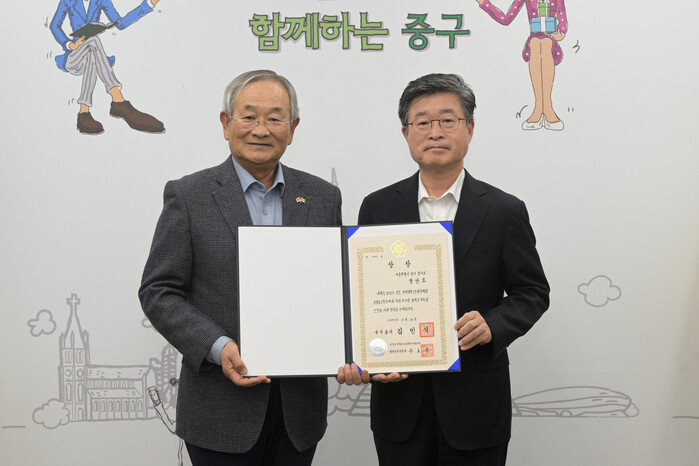 | ▲ 국무총리상 수상자 권안도 씨(왼쪽)과 김길성 중구청장(오른쪽). (사진=중구청 제공) |