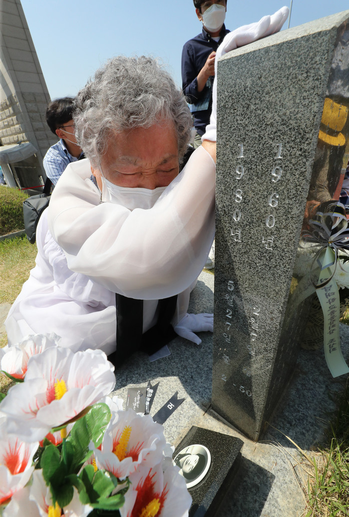제42주년 5.18 민주화운동 기념일을 하루 앞둔 17일 오전 광주 북구 국립 5.18 민주묘지에서 열린 추모제에 참석한 이정연 열사의 어머니가 열사의 묘소 앞에서 오열하고 있다.