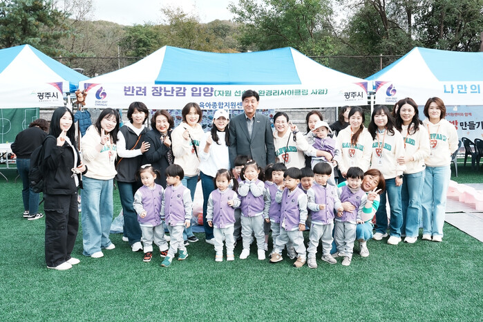 경기 광주시가 최근 남한산성 스포츠타운에서 ‘2025 광주시 보육박람회’를 성황리에 개최했다. 이번 박람회는 영유아와 학부모, 어린이집 관계자 등 보육 가족이 한자리에 모여 함께 즐기고 배우는 소통과 체험의 장으로 마련됐다. 사진은 방세환 시장(가운데)이 어린이 및 관계자들과 기념 촬영을 하는 모습. (사진=광주시청 제공)