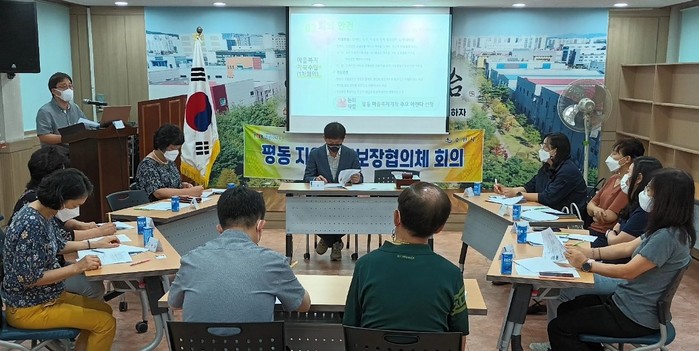 경기 수원시 권선구 평동은 최근 마을복지계획 수립 1차 워크숍을 진행했다. 이날 정기회의에서 제5기 수원시 지역사회보장조사 자료를 토대로 마을복지계획 수립을 위한 의제 설정을 위한 논의를 진행해 ‘노인·아동 통합돌봄’을 주요 의제로 설정했다. 사진은 이날 회의가 진행되고 있는 모습. (사진제공=권선구청)