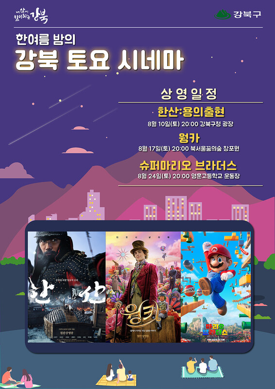 ‘한여름 밤의 강북 토요시네마’는 토요일 오후 8시에 구청 광장(10일), 북서울꿈의숲 창포원(17일), 영훈고등학교 운동장(24일)에서 열린다.