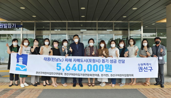 경기 수원시 권선구는 지난 13일 권선구 민간·가정 어린이집연합회 및 어린이집협의회(4개 단체), 권선구 반디어린이집으로부터 경북 포항시의 태풍 피해 복구를 위한 성금을 전달받았다. 사진은 전달식에서 이귀만 구청장(왼쪽 일곱 번째)이 관계자들과 기념촬영을 하고 있는 모습. (사진제공=권선구청)
