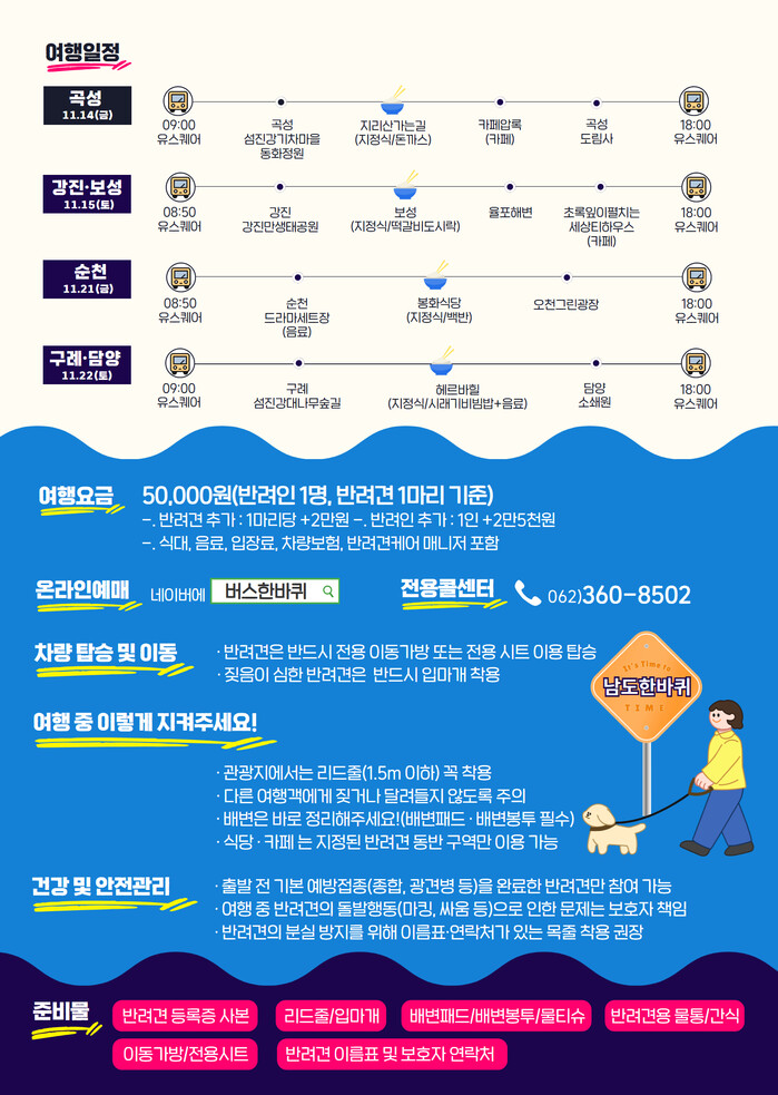최근 반려동물을 가족처럼 여기는 ‘펫팸족(Pet+Family)’이 늘어남에 따라 기획한 이번 코스는 반려견과 함께 남도의 자연과 명소를 둘러보는 여행상품이다. 왕복 교통비, 식·음료, 관광지 입장료 등이 포함된 5만원의 합리적 요금으로 운영된다.