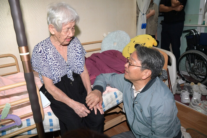 [광주=정찬남 기자] 강기정 광주광역시장이 30일 광주다움 통합돌봄 식사지원 배달현장에 동행, 추석맞이 명절특식 도시락을 어르신에게 전달한 뒤 정담을 나누고 있다. /광주광역시 제공