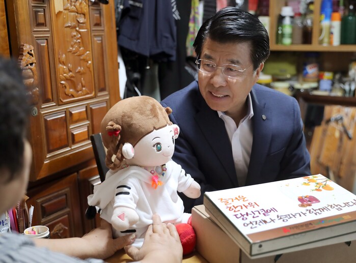 | ▲ 서강석 구청장이 한 홀몸노인 가정에서 AI 반려로봇 ‘효손이’를 살펴보고 있다. (사진=송파구청 제공) |