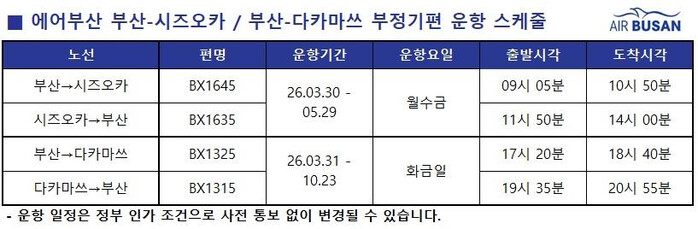 부산발 시즈오카는 오는 3월 30일부터, 다카마쓰는 31일부터 주 3회 일정으로 각각 운항을 시작하며, 인천발 홍콩은 3월 29일부터 주 7회 일정으로, 치앙마이는 4월 29일부터 주 4회 일정으로 운항할 예정이다. 항공권 구매 및 상세 일정은 에어부산 홈페이지 및 모바일 웹·앱을 통해 확인할 수 있다.