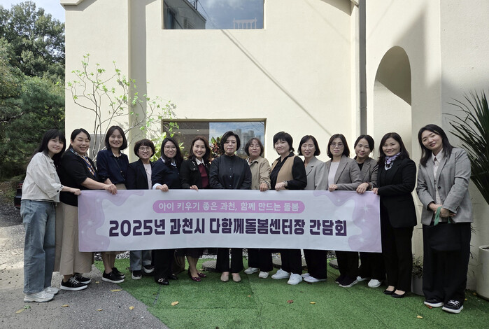 경기 과천시는 15일 신계용 과천시장과 지역내 8개 다함께돌봄센터 센터장들이 참석한 가운데, 다함께돌봄센터 운영 현안과 정책 개선 방향을 논의하는 간담회를 열었다. 사진은 신 시장(왼쪽 일곱 번째)이 참석자들과 기념촬영을 하고 있는 모습. (사진=과천시청 제공)