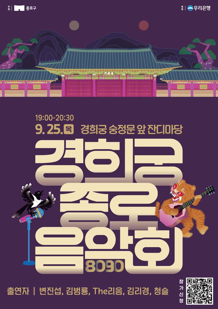가수 변진섭과 김범룡이 ‘너에게로 또다시’, ‘바람 바람 바람’, ‘이젠 안녕’ 등 8090 세대를 아우르는 명곡을 들려준다. 경희궁의 가을 정취를 더할 ‘신사랑가’, ‘아름다운 나라’ 같은 퓨전 국악까지 더해 약 1시간 동안 장르를 넘나드는 무대가 펼쳐질 예정이다.