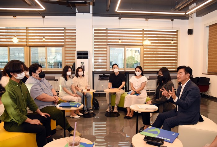 경기 의정부시는 최근 제2기 의정부시 청년협의체 위원 위촉식을 개최했다. 청년협의체 위원들은 오는 2023년 9월까지 14개월의 임기 동안 위원 개인별 관심분야에 따라 일자리 분과 등 총 5개 분과로 나뉘어 활동하게 된다. 사진은 위촉식에서 김동근 시장(오른쪽)이 위원들과 대화를 하고 있는 모습. (사진제공=의정부시청)