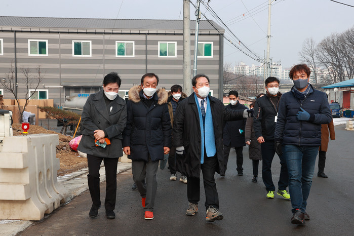 최근 조광한 경기 남양주시장이 올해 초 개통 예정인 오남읍 양지리 삭다니 농어촌도로 확장 공사 현장을 방문해 도로 개설 현장을 점검하고, 공사 관계자들을 격려하는 시간을 보냈다. 사진은 조 시장(가운데) 및 관계자들이 공사 구간을 걸으며 의견을 나누고 있는 모습. (사진제공=남양주시청)
