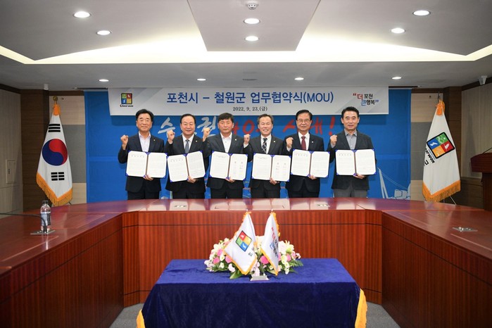 경기 포천시는 23일 철원군청에서 포천-철원 고속도로 조기 착공을 위해 철원군과 공동대응을 주요내용으로 하는 업무협약을 체결했다. 이날 협약에 따라 고속도로 조기 착공을 위한 공동대응, 실무협의체 구성 및 관광, 산업, 교통, 농·축산업 등 주요 역점사업에 대한 연계·발전 등의 대해 협력하기로 했다. 사진은 이날 협약식에서 백영현 시장(오른쪽)이 협약 체결 후 관계자들과 기념촬영을 하는 모습. (사진제공=포천시청)