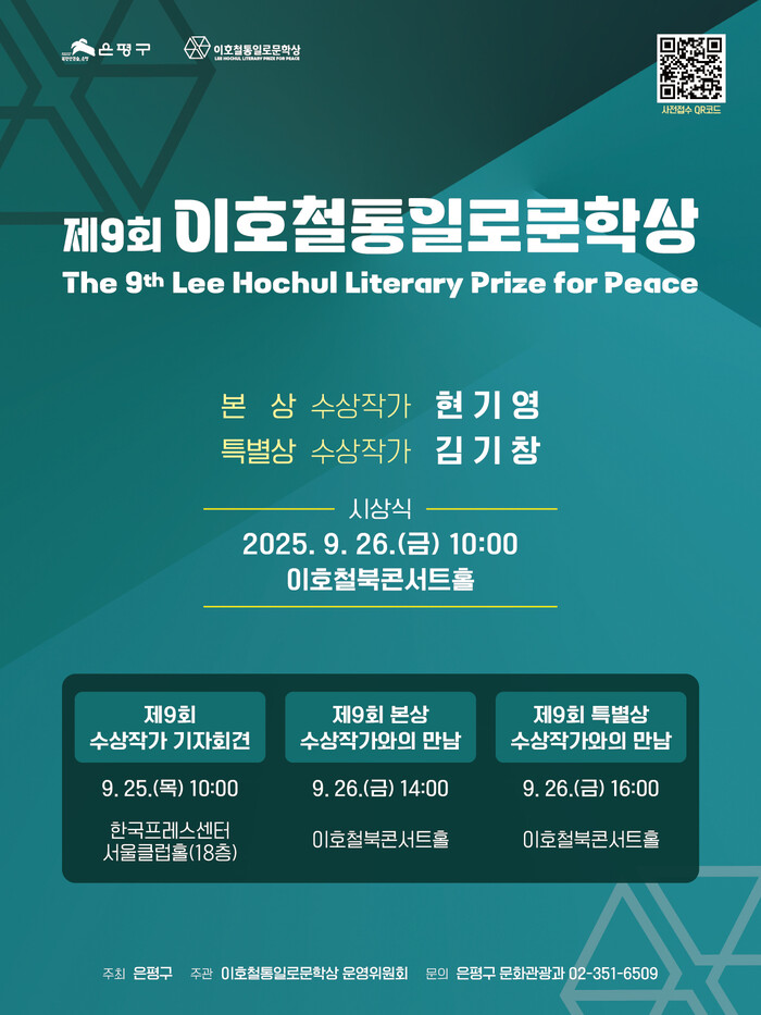 한편 올해로 9회째를 맞은 ‘이호철통일로문학상’은 은평구 불광동에서 50여 년 동안 작품 활동을 해온 통일문학의 대표 문인인 故이호철 작가의 문학 활동과 통일 염원의 정신을 기리고 향후 통일 미래의 구심적 활동을 지향하고자 2017년 은평구에서 제정한 문학상이다.