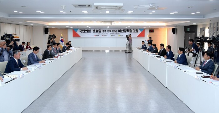이날 회의는 국민의힘이 전국 17개 광역자치단체를 대상으로 순회 실시하는 권역별 예산정책협의회 중 첫 번째 자리로, 광주시·전남도·전북도 등 호남권 3개 시‧도를 대상으로 이뤄졌다.