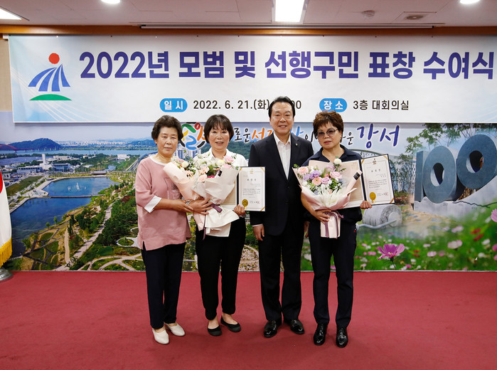 서울 강서구는 지난 21일 ‘2022년 상반기 모범 및 선행구민 표창 수여식’을 개최했다. 수여식에서는 코로나19 방역활동 등 각 분야에서 주민화합과 지역사회 발전에 기여한 2개 단체와 모범구민 22명이 표창장을 받았다. 사진은 노현송 구청장(오른쪽 두 번째)이 표창장 수상자들과 기념촬영을 하고 있는 모습. (사진제공=강서구청)