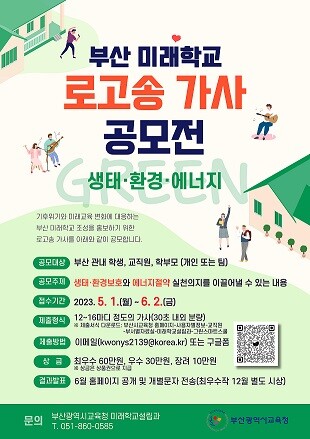이번 공모전은 기후 위기와 미래 교육 변화에 대응하는 부산 미래학교 조성을 홍보하기 위한 것으로 생태·환경보호와 에너지절약을 주제로 실시한다.