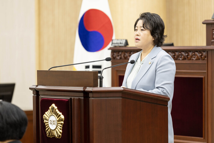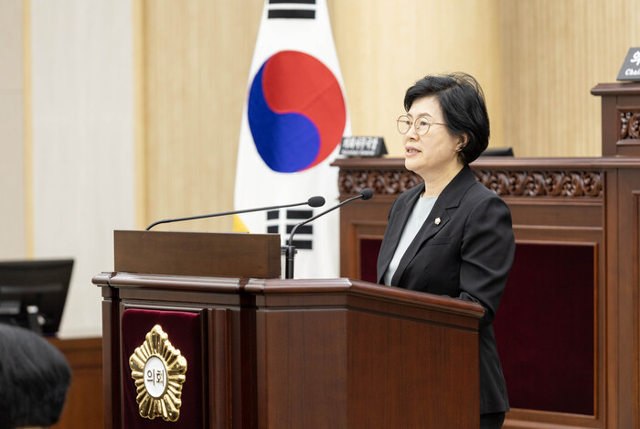 | ▲ 안산시의회 김진숙 의원이 28일 ‘지방자치단체 출자·출연기관의 운영에 관한 법률 개정 촉구 건의안’에 대해 제안 설명을 하고 있는 모습 /사진제공=안산시의회 |