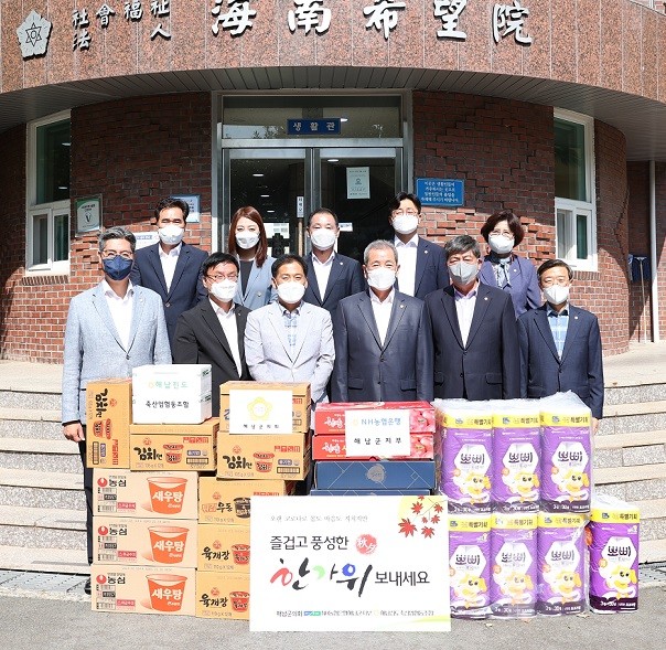 이번 위문은 해남군의회, NH농협은행해남군지부(지부장 이현호), 해남진도축산업협동조합(조합장 한종회)과 함께 해남 평화의 집, 해남등대원, 희망원 등 해남군 관내 14개 노인요양시설 및 아동복지시설을 찾아 생활용품 등을 전달하고 소외된 이웃을 살폈다.