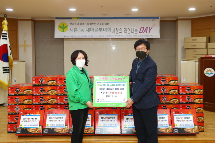 서울 금천구는 9일 시흥1동 새마을부녀회로부터 저소득 노인들을 위한 라면 50상자를 기부받았다. 이번 후원은 ‘연말 이웃 어르신 사랑나눔 바자회’ 수익금으로 마련돼 더욱 의미가 있다. 사진은 전달식에서 관계자들이 기념촬영을 하고 있는 모습. (사진제공=금천구청)