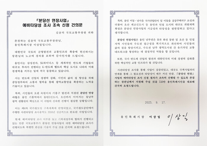 [용인=오왕석 기자] 용인특례시(시장 이상일)는 17일 김윤덕 국토교통부 장관에게 ‘분당선 연장사업’과 ‘경기남부광역철도 사업’의 조속한 추진을 요청하는 이상일 시장의 건의문을 전달했다고 18일 밝혔다.