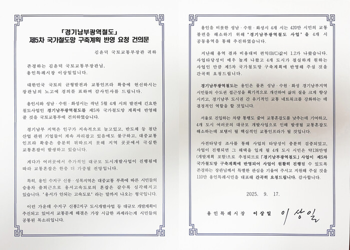 | ▲ 이상일 용인특례시장이 김윤덕 국토교통부 장관에게 전달한 '경기남부광역철도 신설 사업' 적극 추진 요청 건의문.이상일 용인특례시장이 김윤덕 국토교통부 장관에게 전달한 '경기남부광역철도 신설 사업' 적극 추진 요청 건의문. |