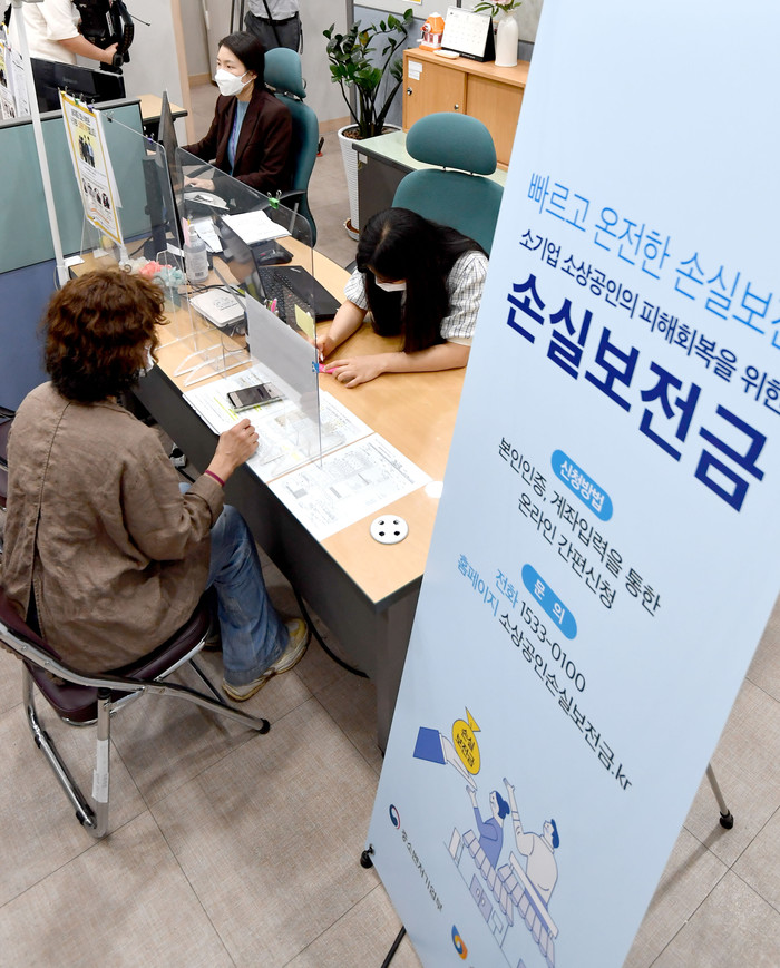 코로나19 방역 조치로 피해를 입은 소상공인·자영업자들은 이르면 30일 오후부터 최대 1000만원의 손실보전금을 받을 수 있다. 중소벤처기업부는 소상공인 손실보상 등을 위한 총 62조원 규모의 추가경정예산(추경)안이 전날 밤 국회 본회의를 통과함에 따라 이날 오전 국무회의 확정 절차를 거쳐 손실보전금 집행 절차에 착수한다. 이날 오전 서울 종로구 소상공인시장진흥공단 서울중부센터에서 자영업자가 소상공인 손실보전금 관련 상담을 받고 있다.