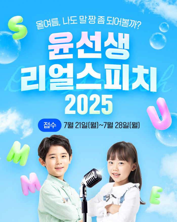 영어교육 전문기업 윤선생은 방학 시즌에 맞춰 영어 말하기 콘테스트 ‘윤선생 리얼스피치 2025’를 실시하고, 오는 21일부터 28일까지 약 1주일간 참가 접수를 받는다.
