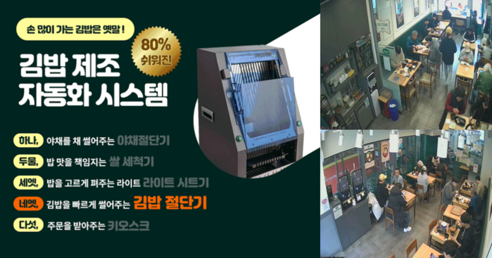 자동화 시스템은 야채 절단기, 쌀 세척기, 라이트 시트기, 김밥 절단기, 키오스크 등으로 구축했으며 ‘김밥집은 손이 많이 간다’는 세간의 인식을 깨고 1인창업에 최적화되어 있는 김밥 제조 시스템을 완성했다.