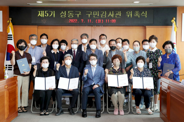 서울 성동구는 지난 11일 제5기 성동구 구민감사관 24명을 대상으로 위촉식을 개최했다. 위촉된 구민감사관은 토목·치수 등 기술분야 전문감사관 7명과 각동 주민대표격인 일반감사관 17명으로 이달부터 오는 2024년 6월까지 구민감사관 역할을 수행하게 된다. 사진은 위촉식에서 정원오 구청장(앞줄 가운데)과 구민감사관들이 기념촬영을 하는 모습. (사진제공=성동구청)