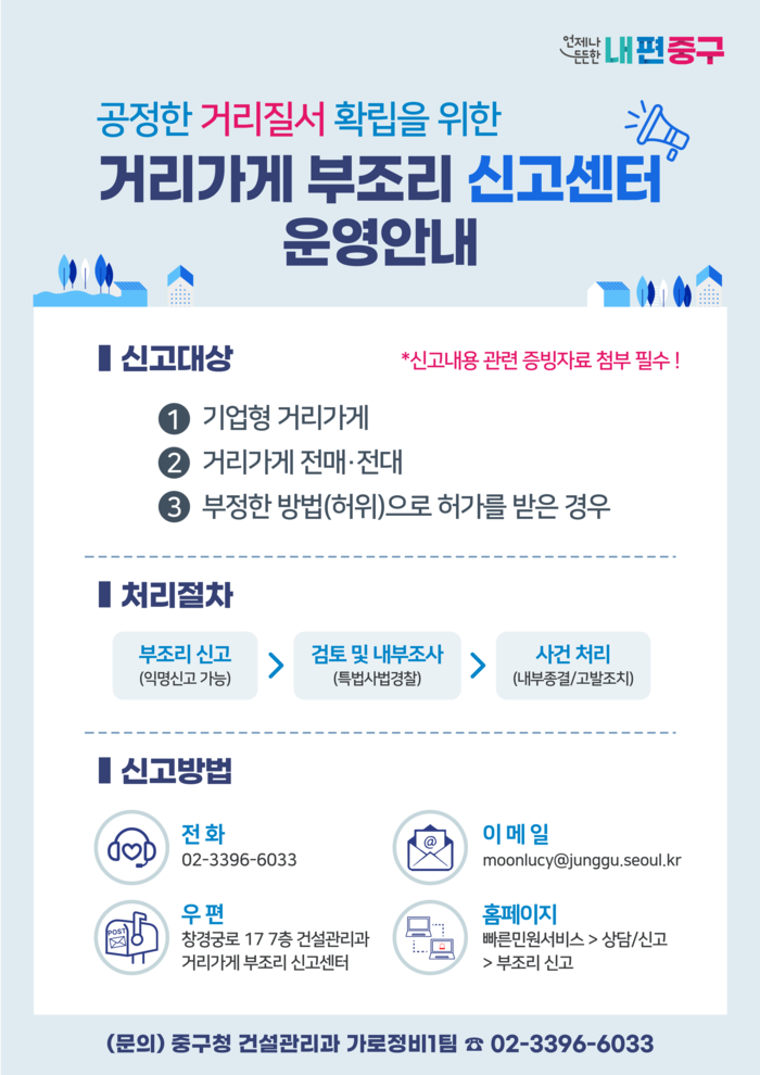 신고는 방문(중구청 7층 건설관리과)·전화·이메일(moonlucy9@junggu.seoul.kr)·중구청 홈페이지(빠른민원서비스>상담/신고>부조리 신고)를 통해 누구나 할 수 있다.