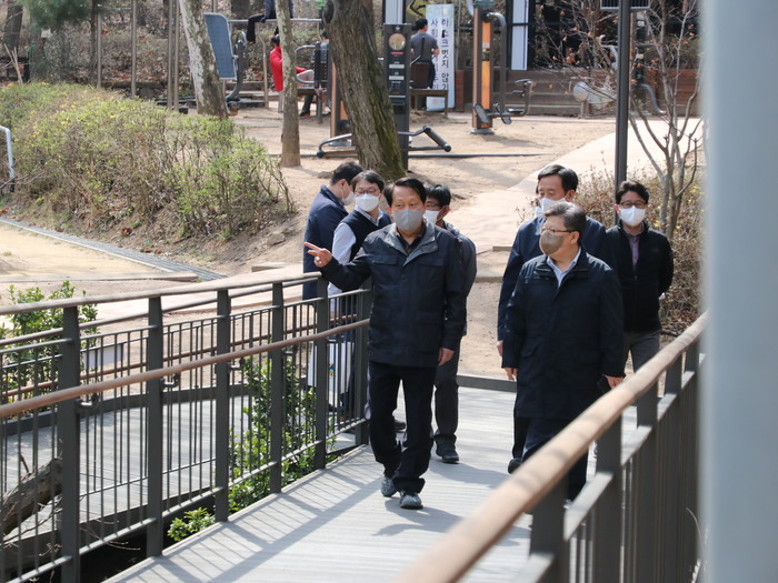 이성 서울 구로구청장이 지난 5일 이회승 부구청장 및 주요 간부 등과 함께 개웅산을 찾았다. 사진은 이날 이 구청장(왼쪽)이 이 부구청장과 개웅산을 걸으며 대화를 나누고 있는 모습. (사진제공=구로구청)