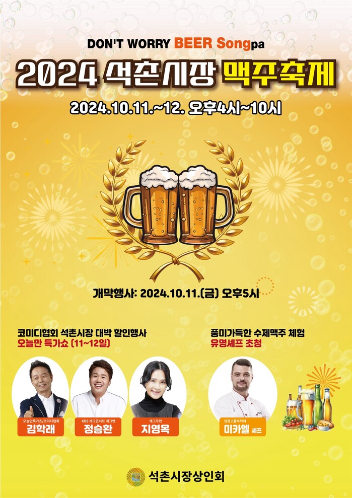 송파구(구청장 서강석)는 오는 10월 11일(금)과 12일(토) 16시부터 22시까지 「석촌시장 맥주축제」를 개최한다고 밝혔다.