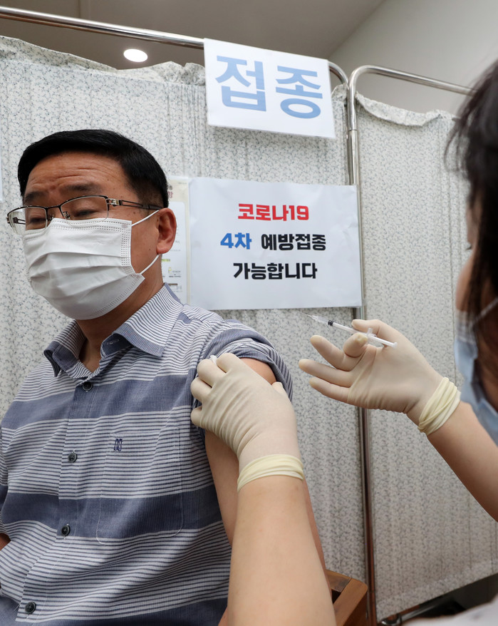 50대 연령층에 대한 코로나19 4차 백신 접종이 시작된 18일 오전 광주 북구 중흥동의 한 병원에서 50대 북구청 공무원이 백신 접종을 받고 있다.