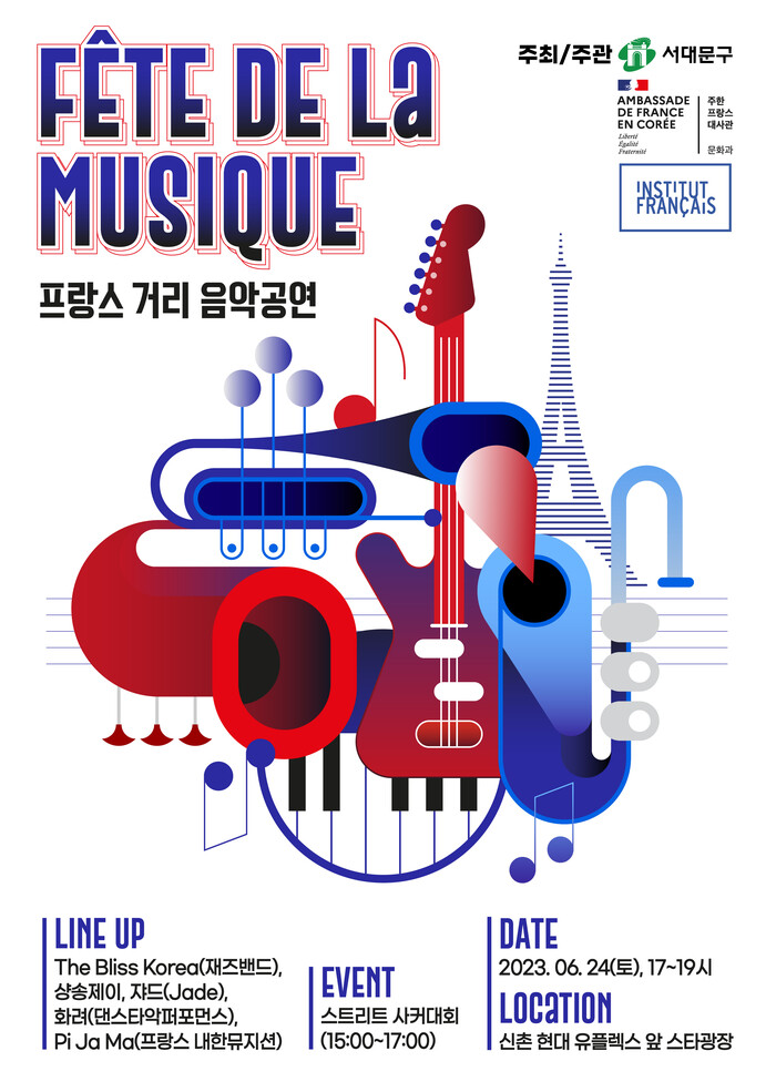 주한프랑스대사관이 후원하는 이날 공연에는 재즈 밴드인 '더 블리스 코리아'(The Bliss Korea), 가수 '샹송제이'(Chanson J)와 '쟈드'(Jade), 댄스타악퍼포먼스 팀 '화려' 등이 출연한다.