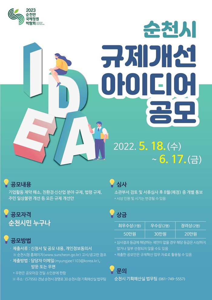 [순천=이문석 기자] 전남 순천시는 일상생활에서 겪는 각종 불합리한 규제와 기업 활동에 걸림돌이 되는 규제를 시민과 함께 발굴하고 개선하기 위해 오는 6월17일까지 ‘순천시 규제개선 아이디어’를 공모한다고 밝혔다.