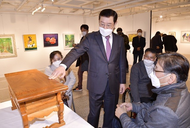 이용섭 광주광역시장, 광주장애인미술협회 '쪽빛하늘' 전시회 관람