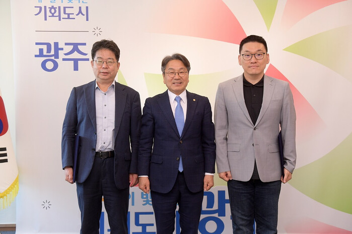 [광주=정찬남 기자] 강기정 광주광역시장이 15일 시청 접견실에서 광주시 AI총괄정책자문관인 박성현 리벨리온 대표(사진 오른쪽)와 빅데이터총괄정책자문관인 나명환 전남대학교 통계학과 교수(사진 왼쪽)에게 위촉장을 수여하고 기념촬영을 하고 있다./광주광역시 제공
