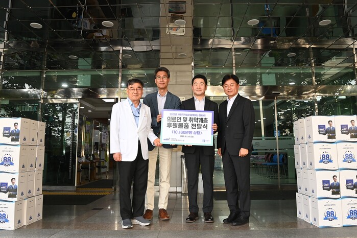 경기 부천시가 최근 사회적기업 (주)위드플러스시스템으로부터 의료인과 취약계층을 위해 라면 선물세트 6350박스를 기탁받았다. 사진은 전달식에서 조용익 시장(맨 오른쪽)이 기념 촬영을 하는 모습. (사진=부천시청 제공)