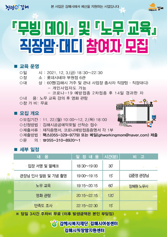 (재)김해시복지재단 김해시여성센터에서는 오는 12월 3일 금요일 저녁 7시부터 10시까지 롯데시네마 부원점 6관에서 일·가정 양립 병행으로 지친 직장맘과 직장대디(휴직자도 가능)를 대상으로 노무교육과 함께 영화관람 프로그램을 운영한다고 밝혔다.