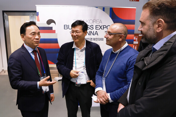 | ▲ 지난해 10월 29일 세계한인경제인대회 엑스포에서 해외 바이어들과 이야기를 나누는 조성명 강남구청장. (사진=강남구청 제공) |