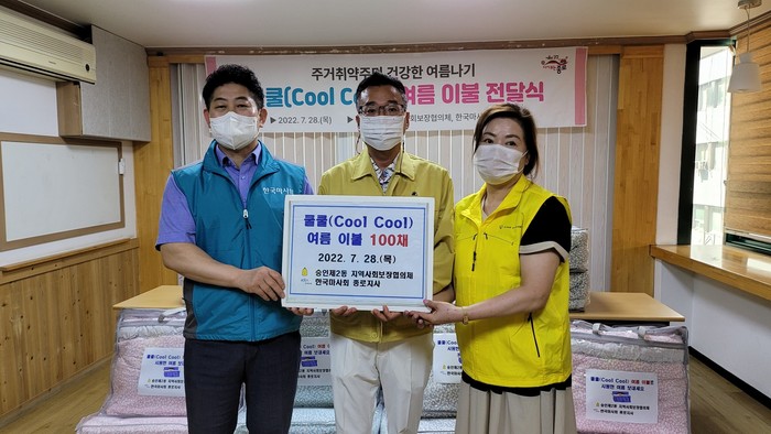 서울 종로구 숭인2동이 최근 한국마사회 종로지사의 후원으로 무더위가 기승을 부리는 때를 맞아 저소득 주민 등에게 시원한 여름용 이불을 전달하는 '쿨쿨 여름이불' 지원에 나섰다. 대상은 지역내 고시원에 거주 중인 주민 등 이불 세탁이 어려운 주거취약계층 100가구다. 사진은 전달식에서 관계자들이 기념촬영을 하는 모습. (사진제공=종로구청)
