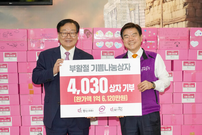 [시민일보 = 이대우 기자] 서울 동대문구(구청장 이필형)가 동안교회 및 동안복지재단에서 부활절을 맞아 4만원 상당의 기쁨나눔상자 4030개를 기탁했다고 밝혔다.
