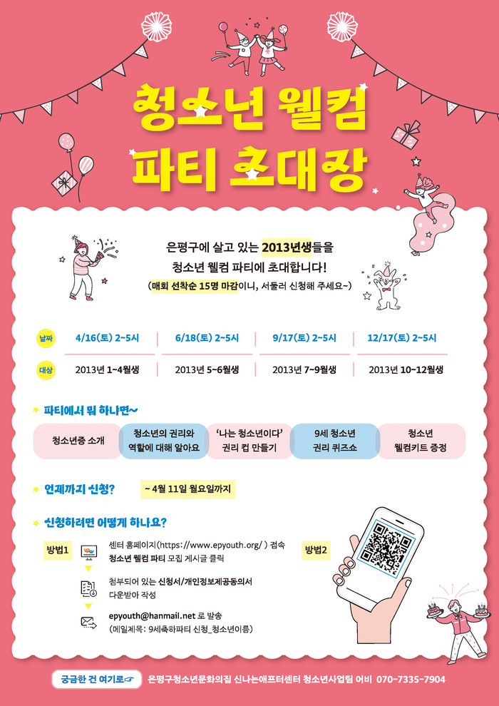[시민일보 = 이대우 기자] 서울 은평구청소년문화의집 신나는애프터센터에서는 ‘청소년 웰컴 파티’ 참가자를 모집한다.