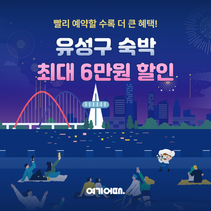 여기어때는 프로모션 기간 유성구를 방문하는 관광객을 위해 지역 숙소 전용 최대 6만원 할인 쿠폰을 선착순 지급한다. 쿠폰 발급 및 사용은 이달 14일까지며, 체크인은 3일부터 19일까지 가능하다.