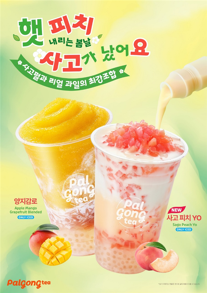 팔공티는 쫀득한 식감의 사고 펄과 상큼한 과일의 조합을 콘셉트로 복숭아 사고 ‘아삭피치YO’, ‘사고피치YO’와 망고 사고 ‘양지감로’ 구성의 3종을 선보인다.