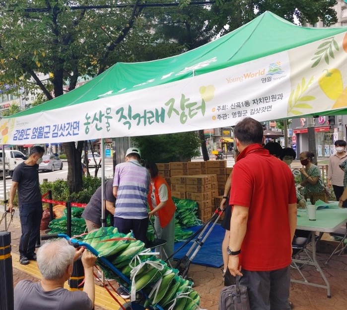 경기 의정부시 신곡1동행정복지센터는 최근 자매결연지 강원 영월군 김삿갓면의 옥수수와 감자의 판매를 위한 직거래 장터를 개최했다. 이번 장터는 코로나19 확산 방지를 위해 사전예약제로 실시했으며, 품질 좋은 농산물을 저렴한 가격에 공급했다. 사진은 이날 주민들이 직거래 장터를 이용하고 있는 모습. (사진제공=의정부시청)