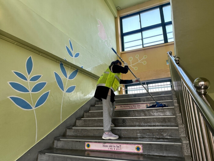 | ▲ 건물 계단 청소하는 '클린업' 소속 근로자. (사진=동대문구청 제공) |