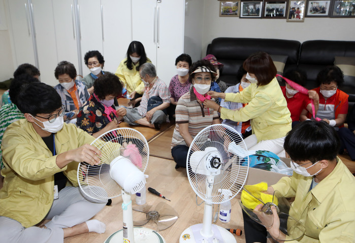 광주에 폭염 경보가 발효된 4일 광주 북구 동림동 한 아파트 경로당에 마련된 무더위쉼터에서 북구청 노인복지과 직원들이 선풍기 등 냉방기구 점검과 쿨스카프를 전달하고 있다.