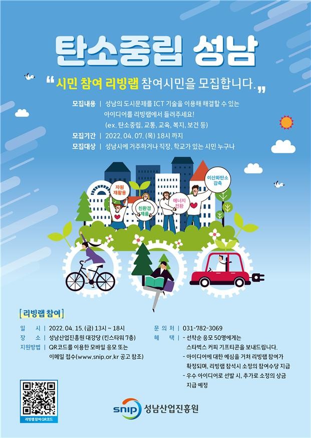 [성남=오왕석 기자] 성남산업진흥원은 '탄소중립 성남' 시민참여 리빙랩을 오는 4월15일에 개최할 예정이다.